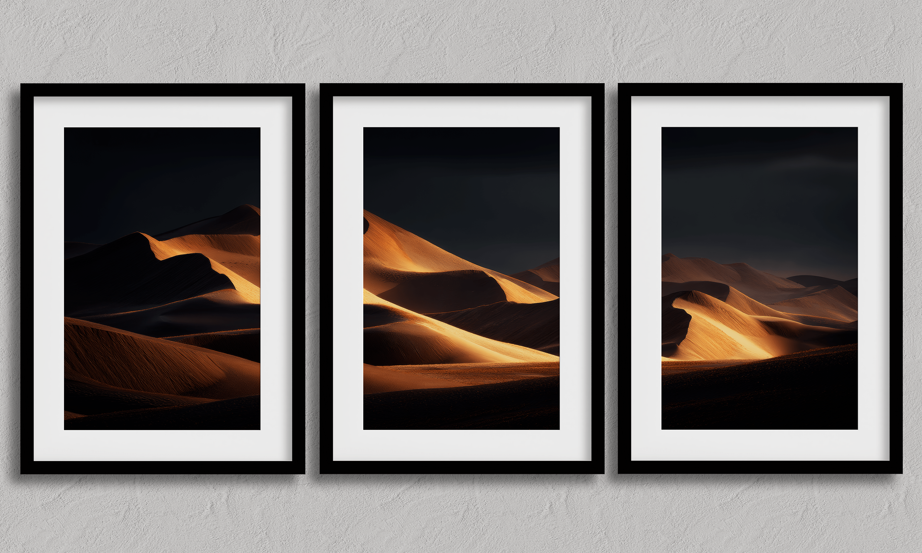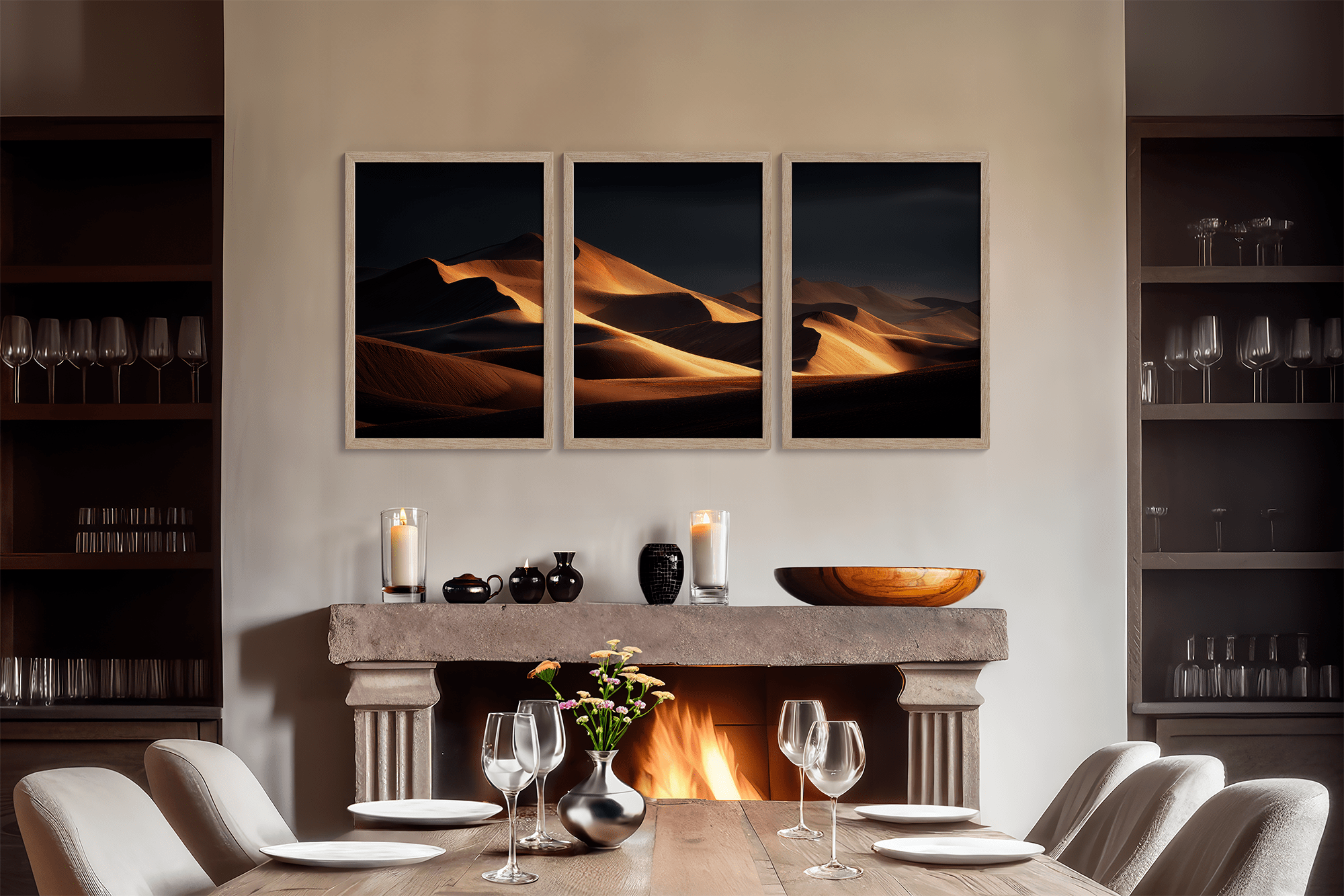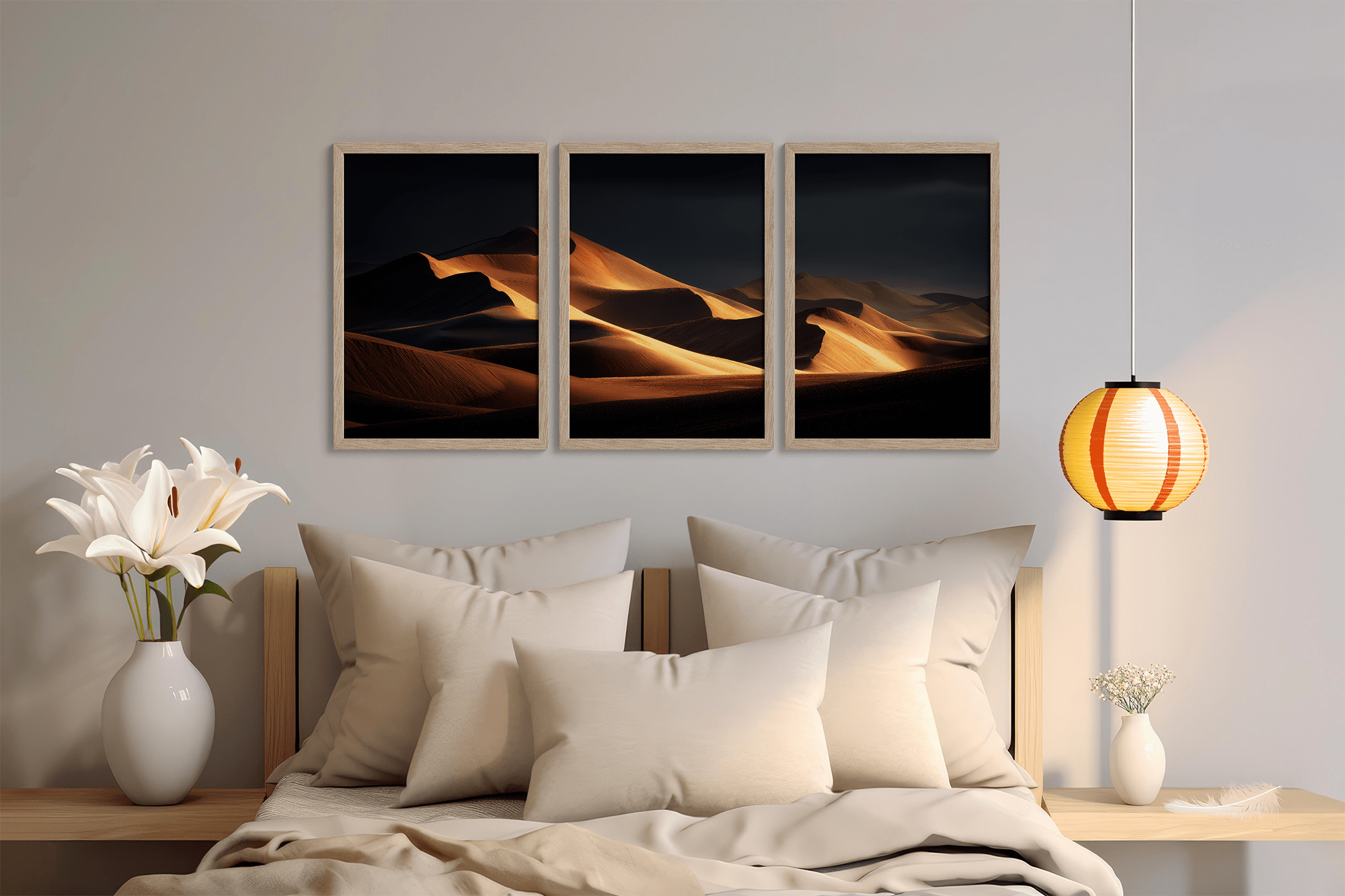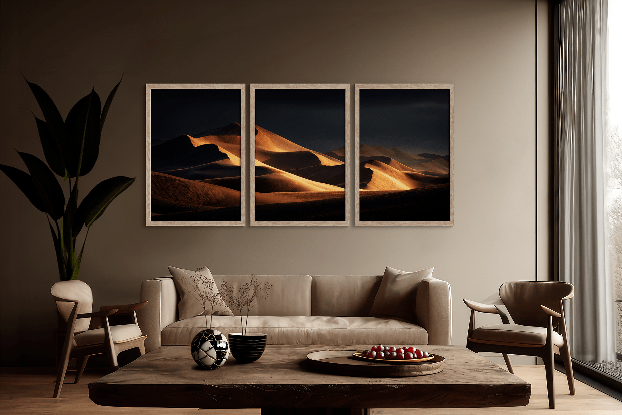 Desert Serenity – Golden Desert Dunes Triptych Wall Art Print