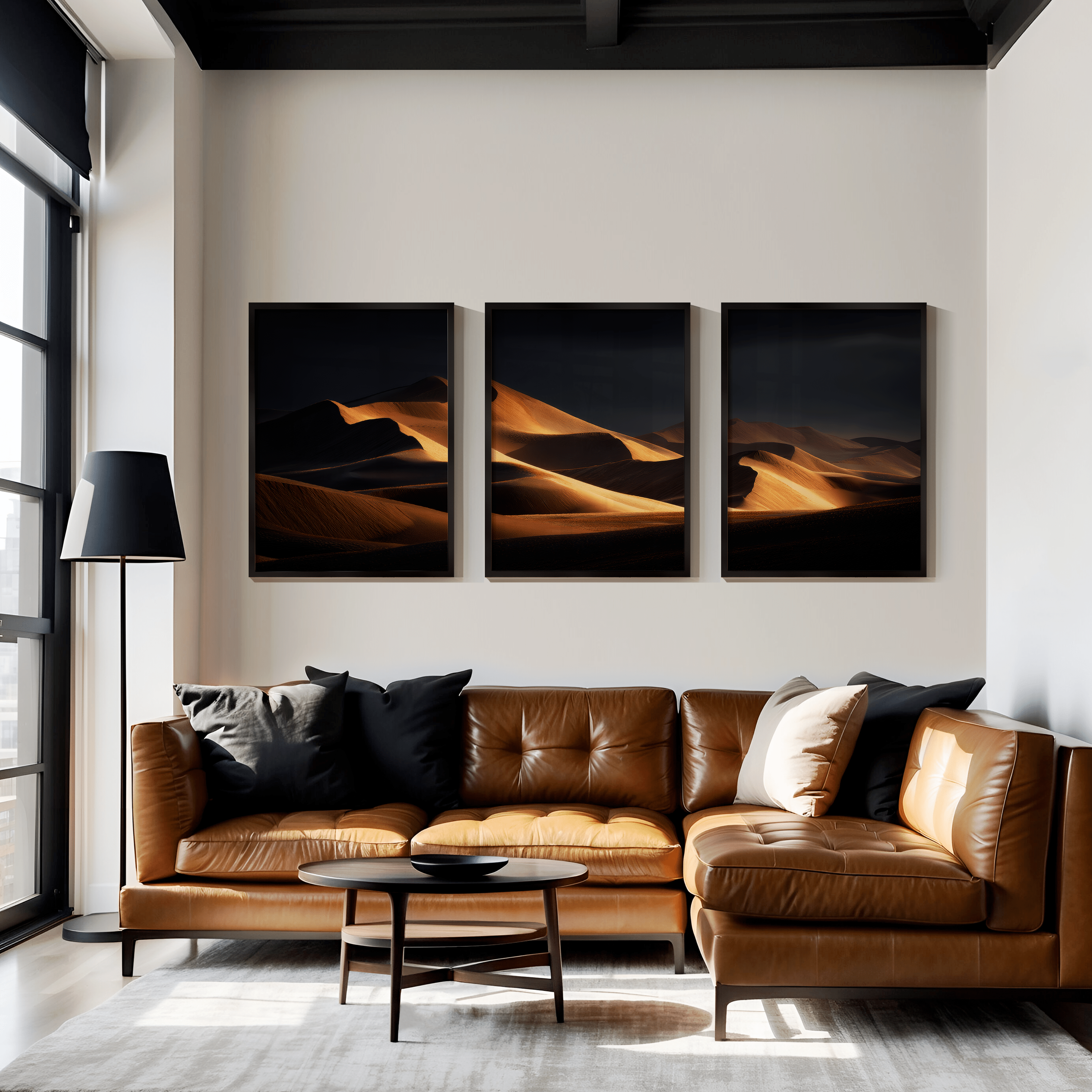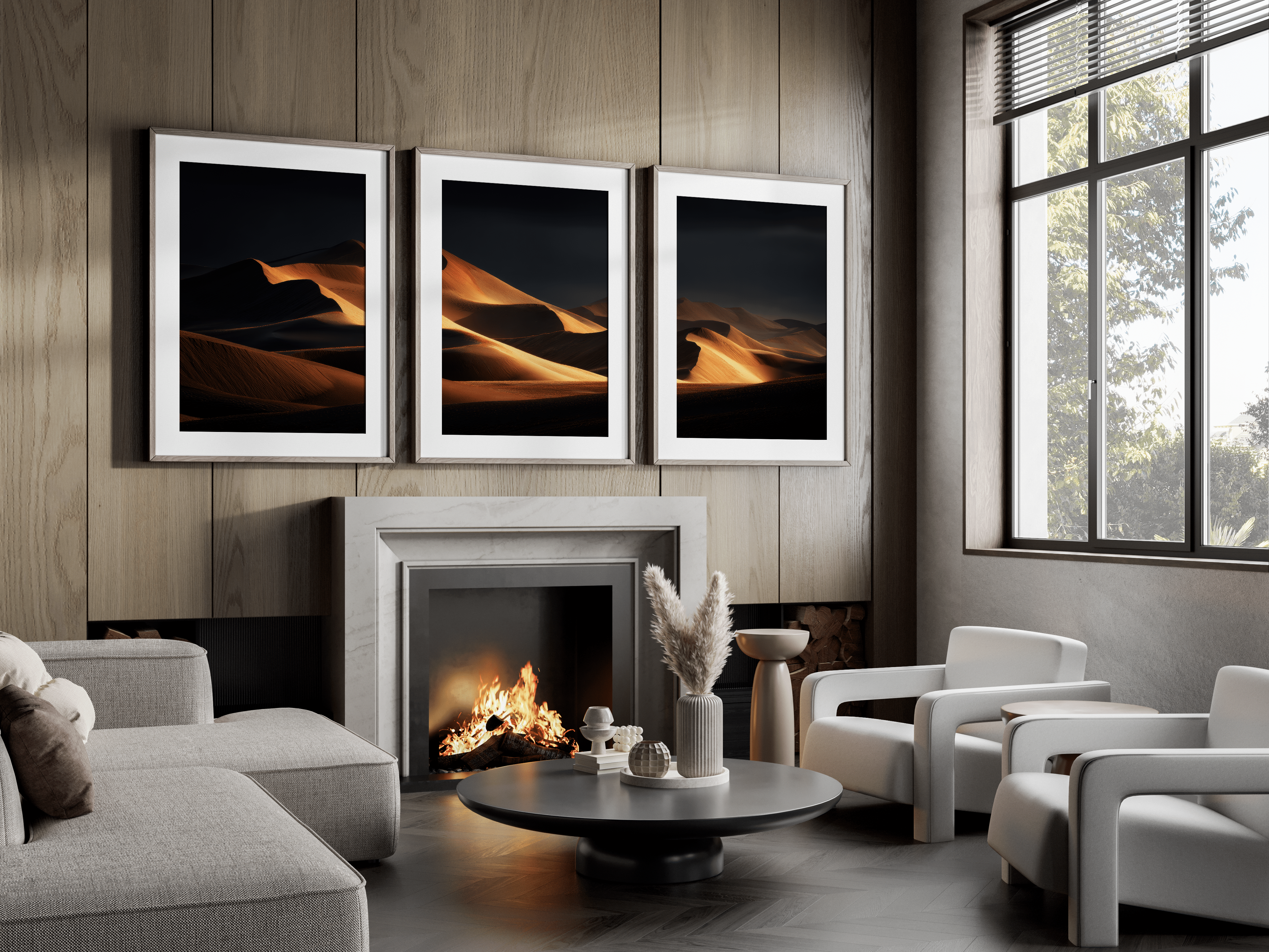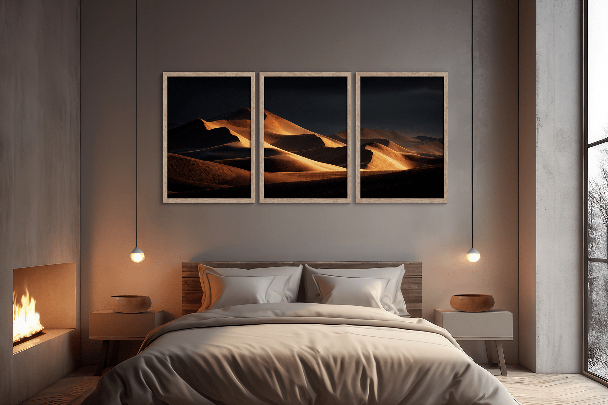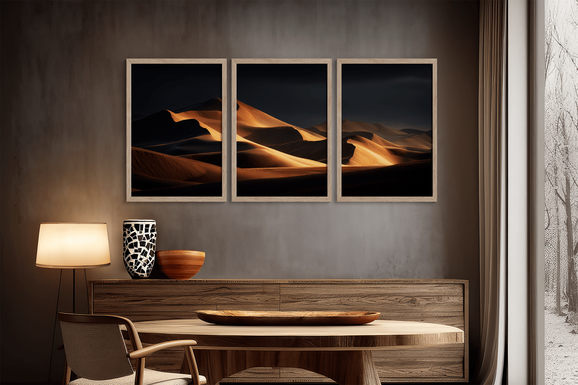 Desert Serenity – Golden Desert Dunes Triptych Wall Art Print