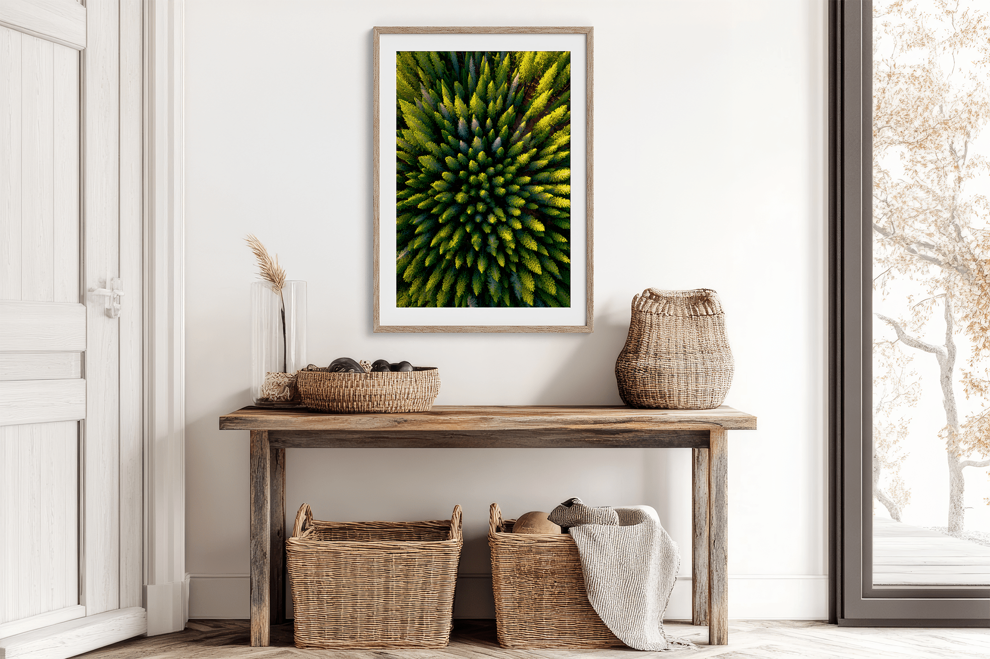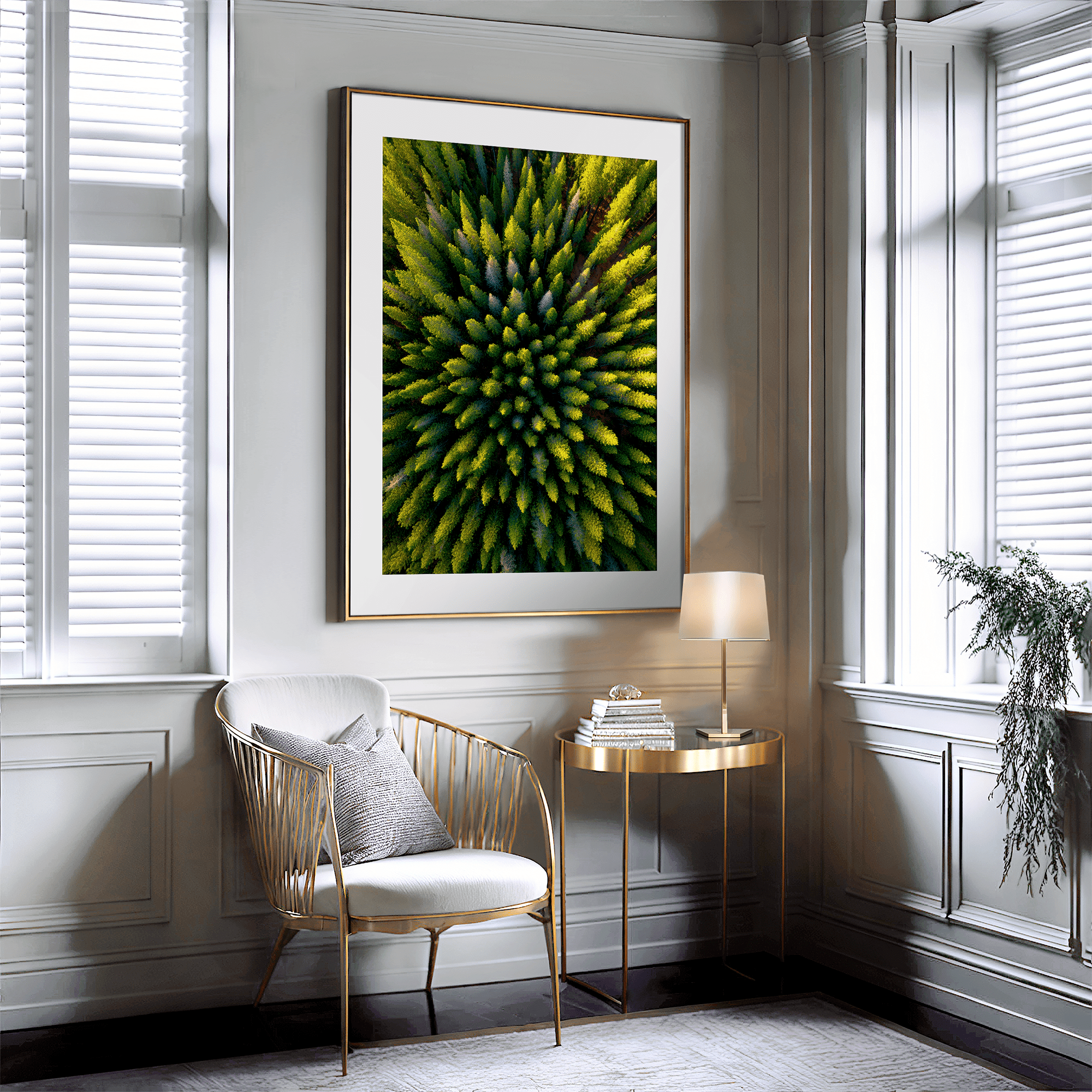 Printed on archival-quality fine art paper and beautifully framed in sustainably sourced wood, this artwork blends geometric elegance with organic calm. Perfect for modern interiors, nature-inspired spaces, or as a striking centrepiece that balances structure and serenity.