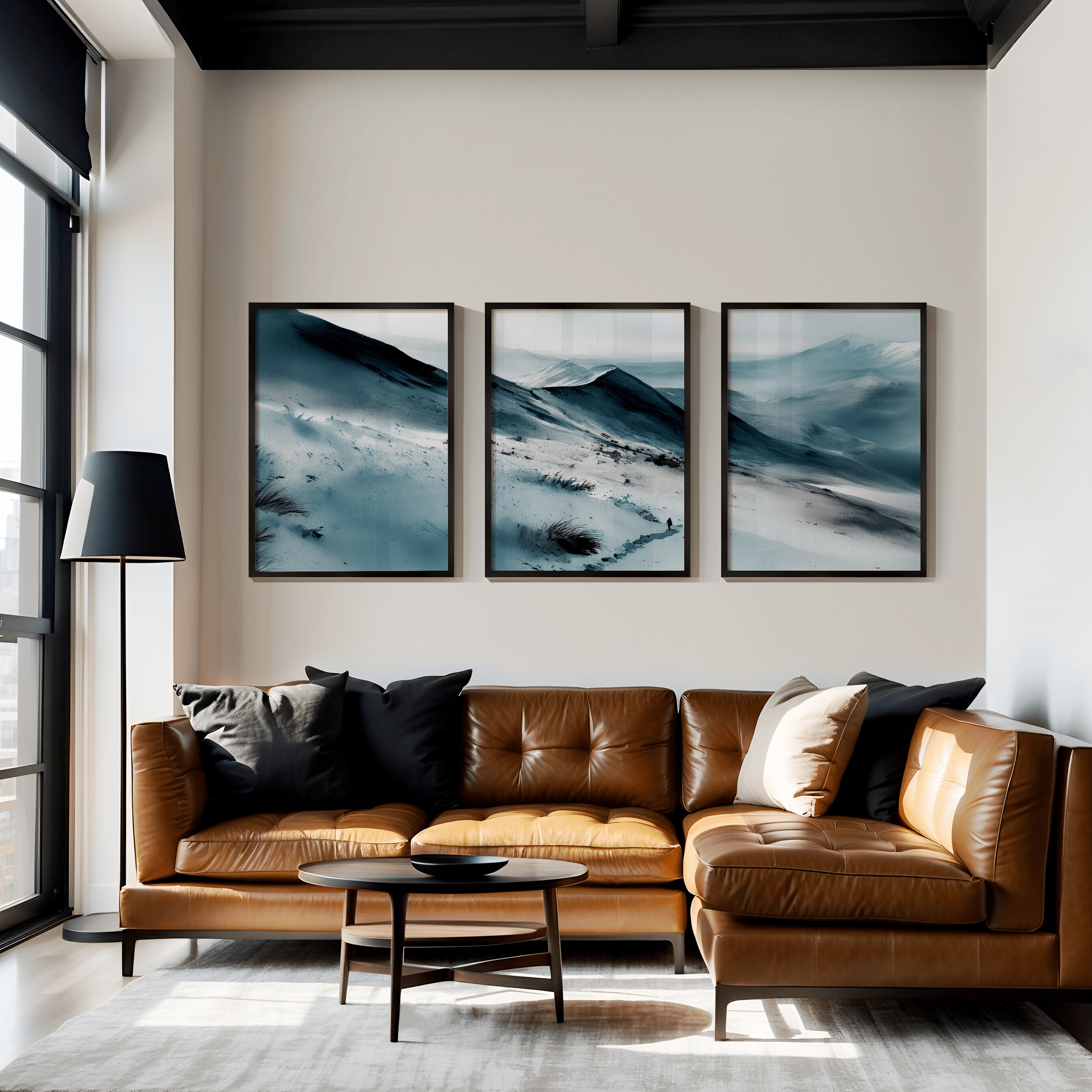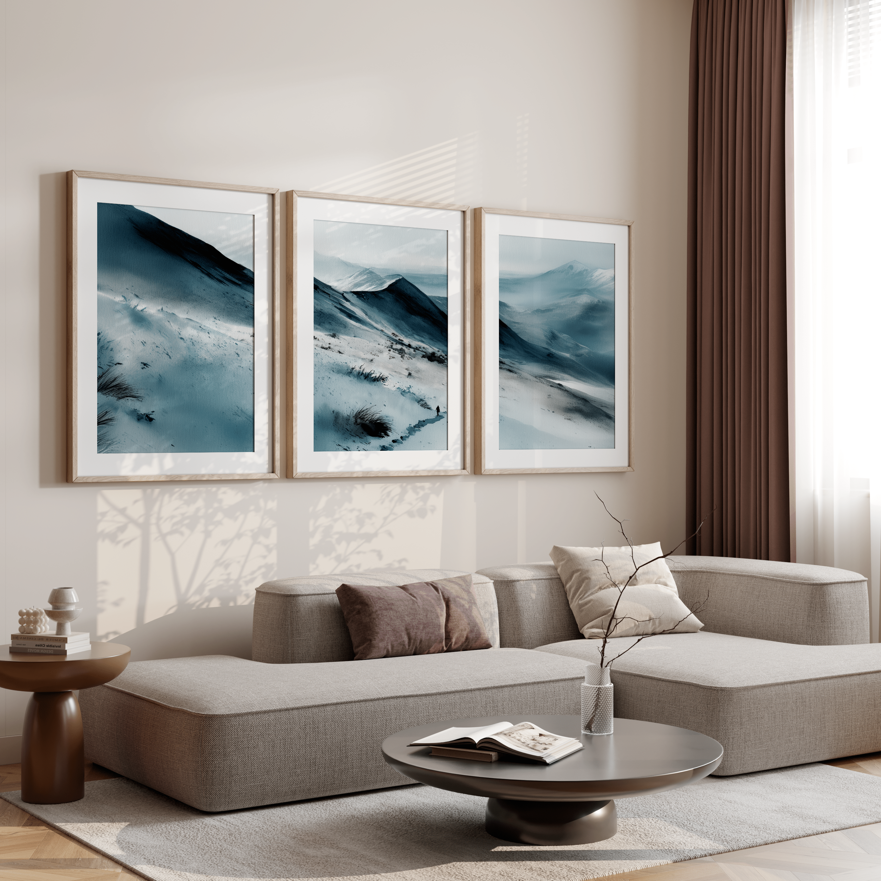 This modern mountain artwork blends natural beauty with refined simplicity, making it a versatile centrepiece for living rooms, bedrooms, or offices. The triptych format adds depth and scale, transforming your wall into a serene window to the outdoors.