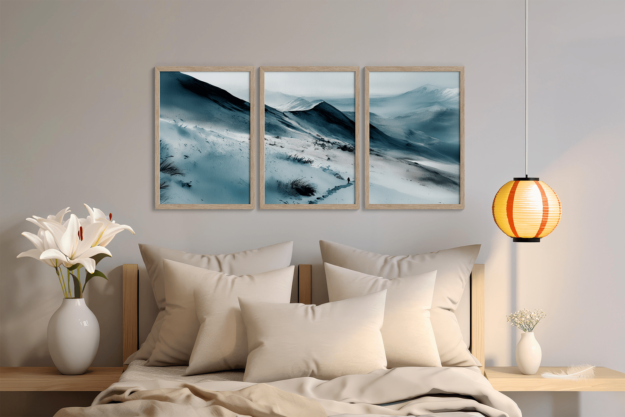 Elevate your home with Serenity’s Peaks, a three-panel triptych wall art set that captures the quiet grandeur of snow-covered mountains in a minimalist watercolour style. Gentle washes of blue and grey flow seamlessly across the panels, creating a panoramic landscape that evokes stillness, balance, and timeless calm.