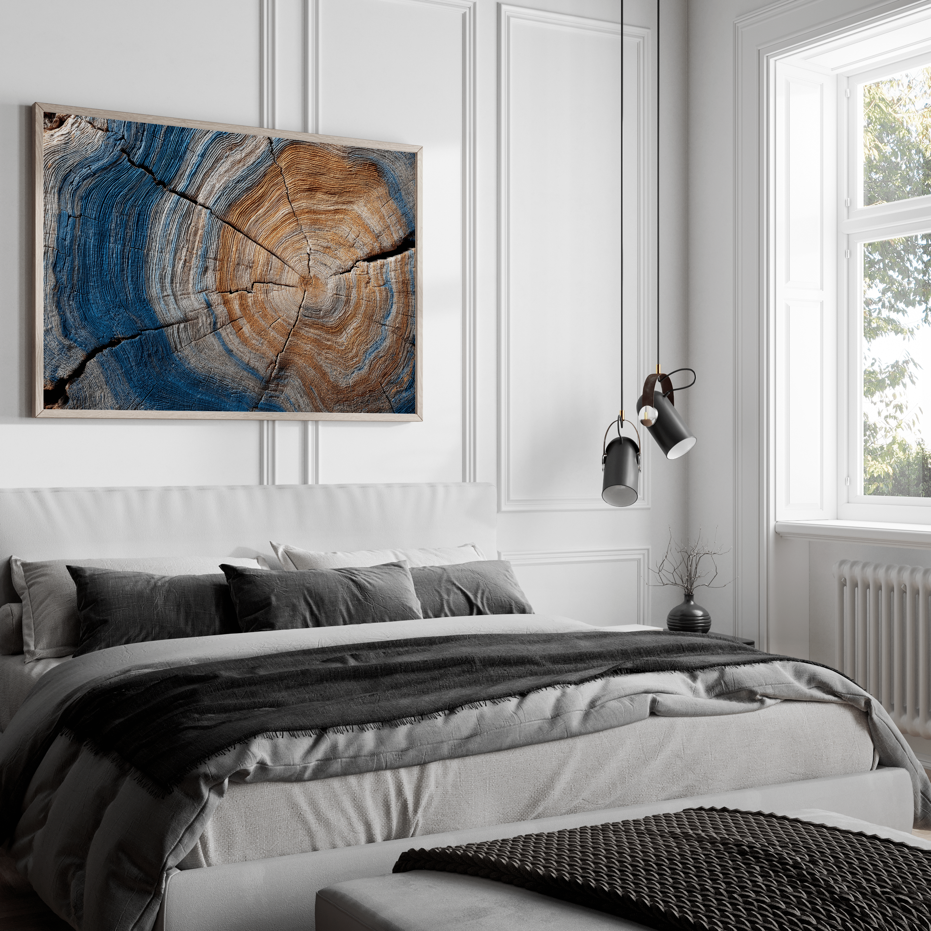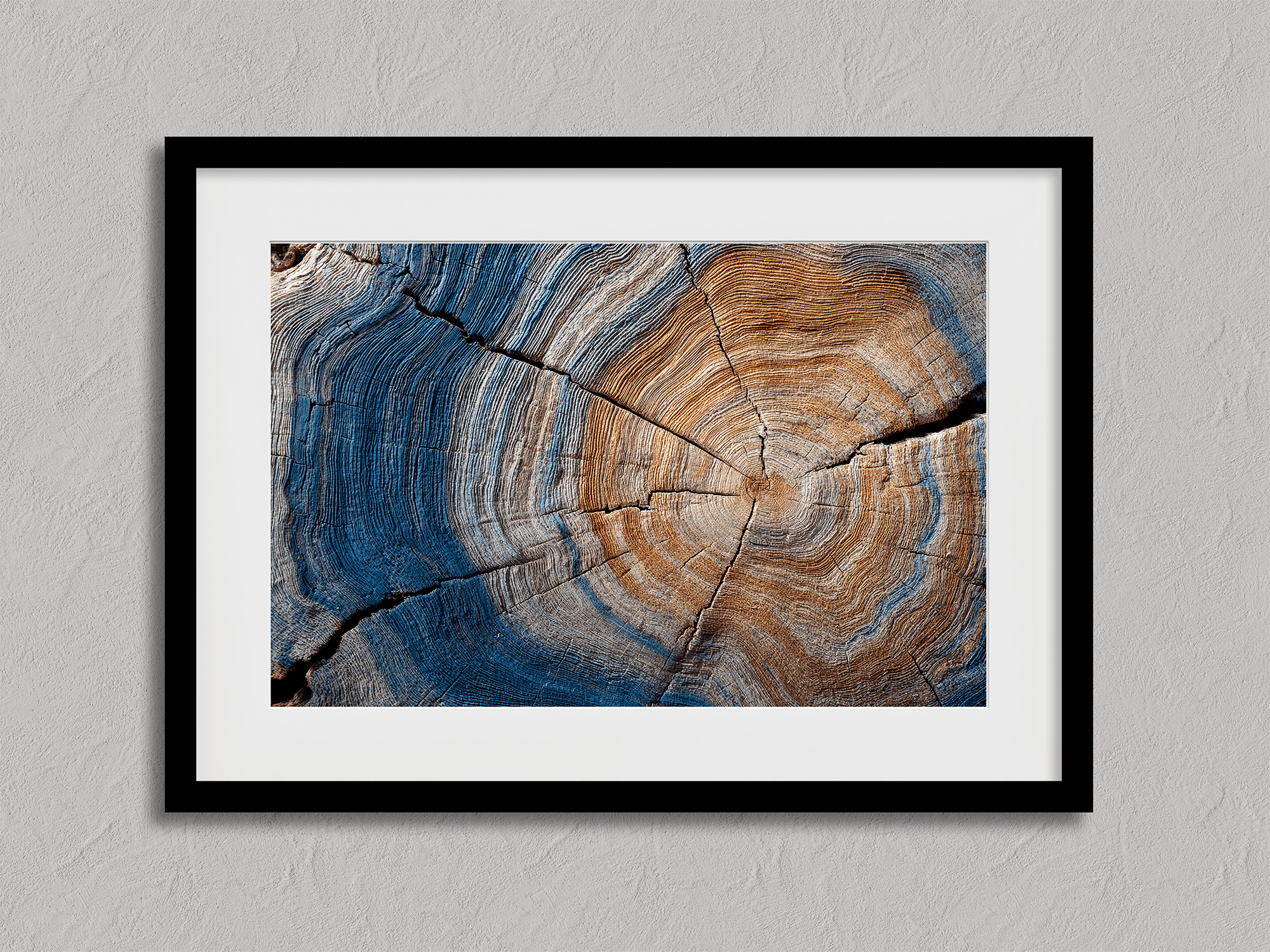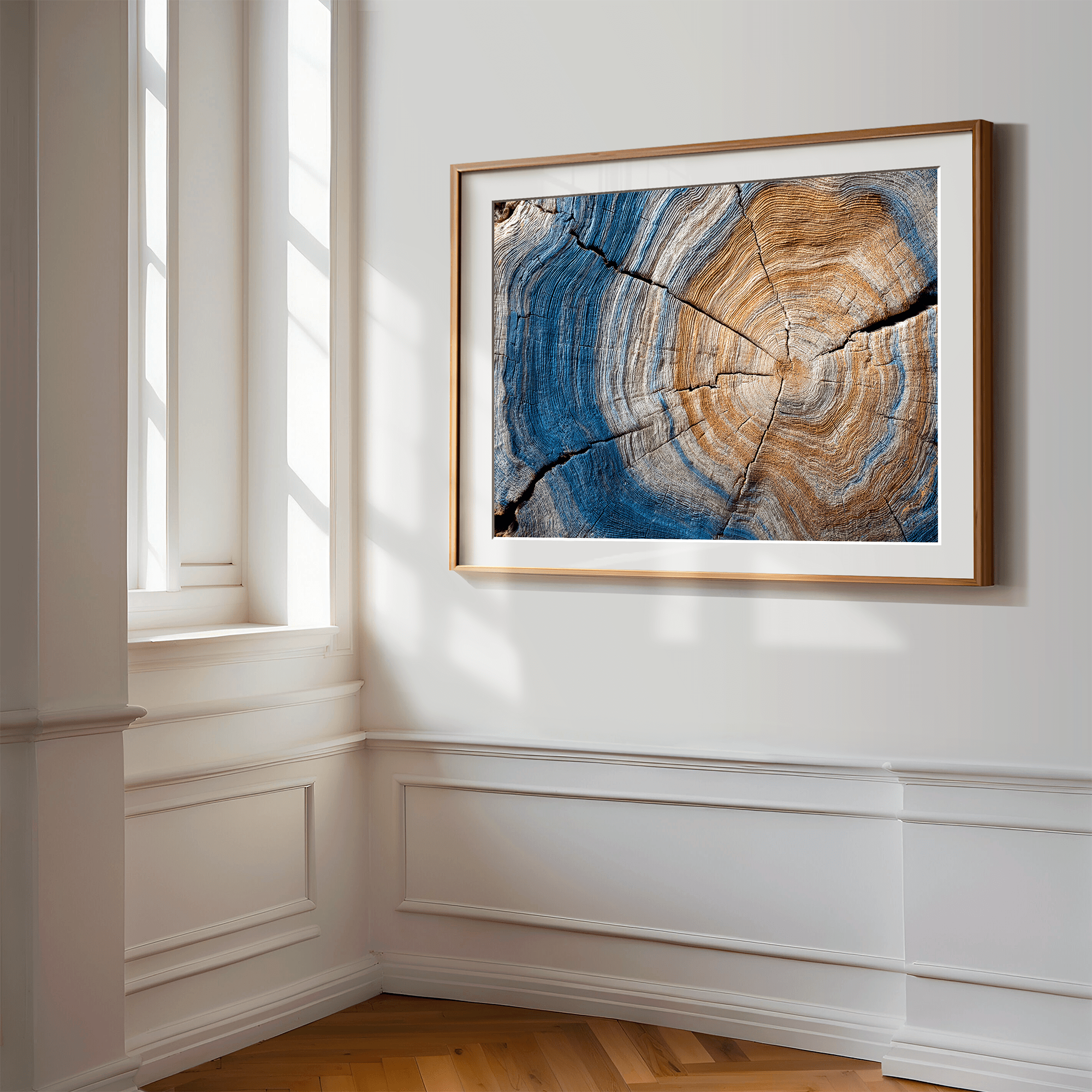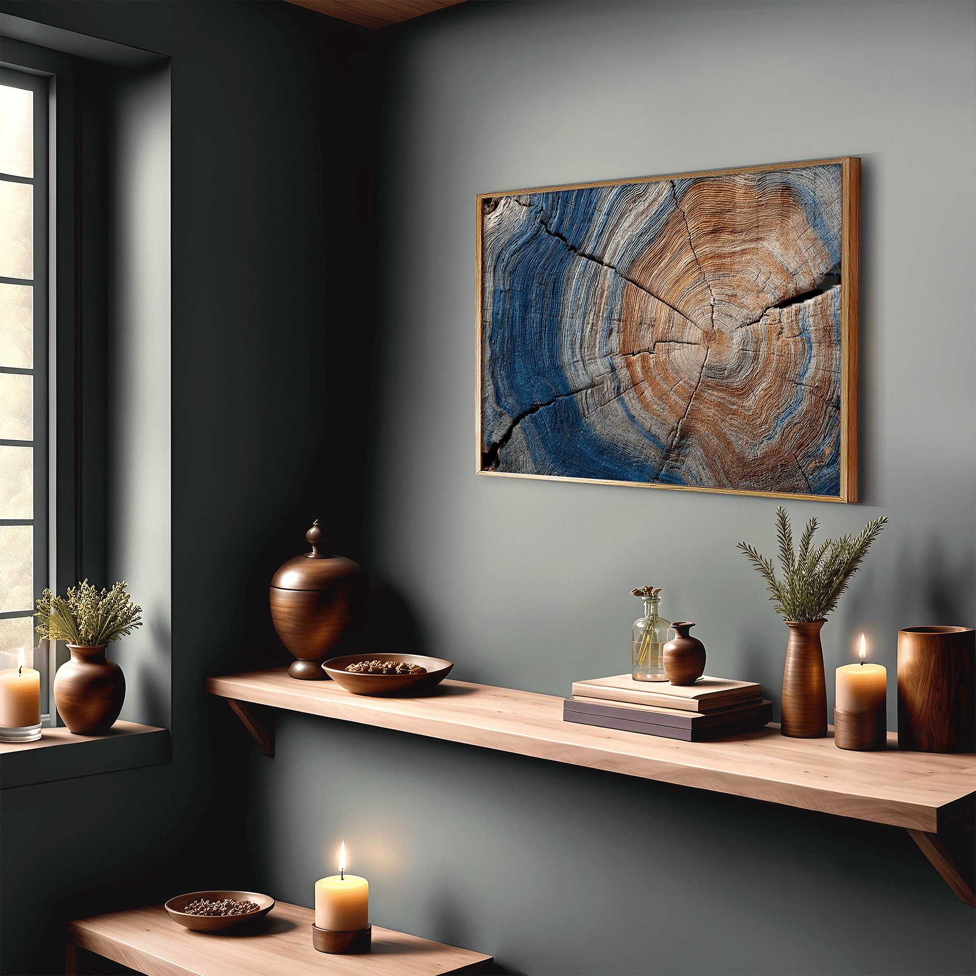 Bring the passage of time into your home with Years of the Earth – Horizontal Tree Ring Print, a framed fine art piece that reveals the quiet beauty of nature’s memory. Each ring tells a story—of seasons, growth, drought, and bloom—etched into rich woodgrain and deepened by blue-grey shadows.